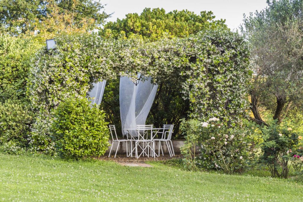 La proprietà è circondata da ulivi sul retro, bosco sulla destra e giardino con essenze fiorite tutte le stagioni di fronte.